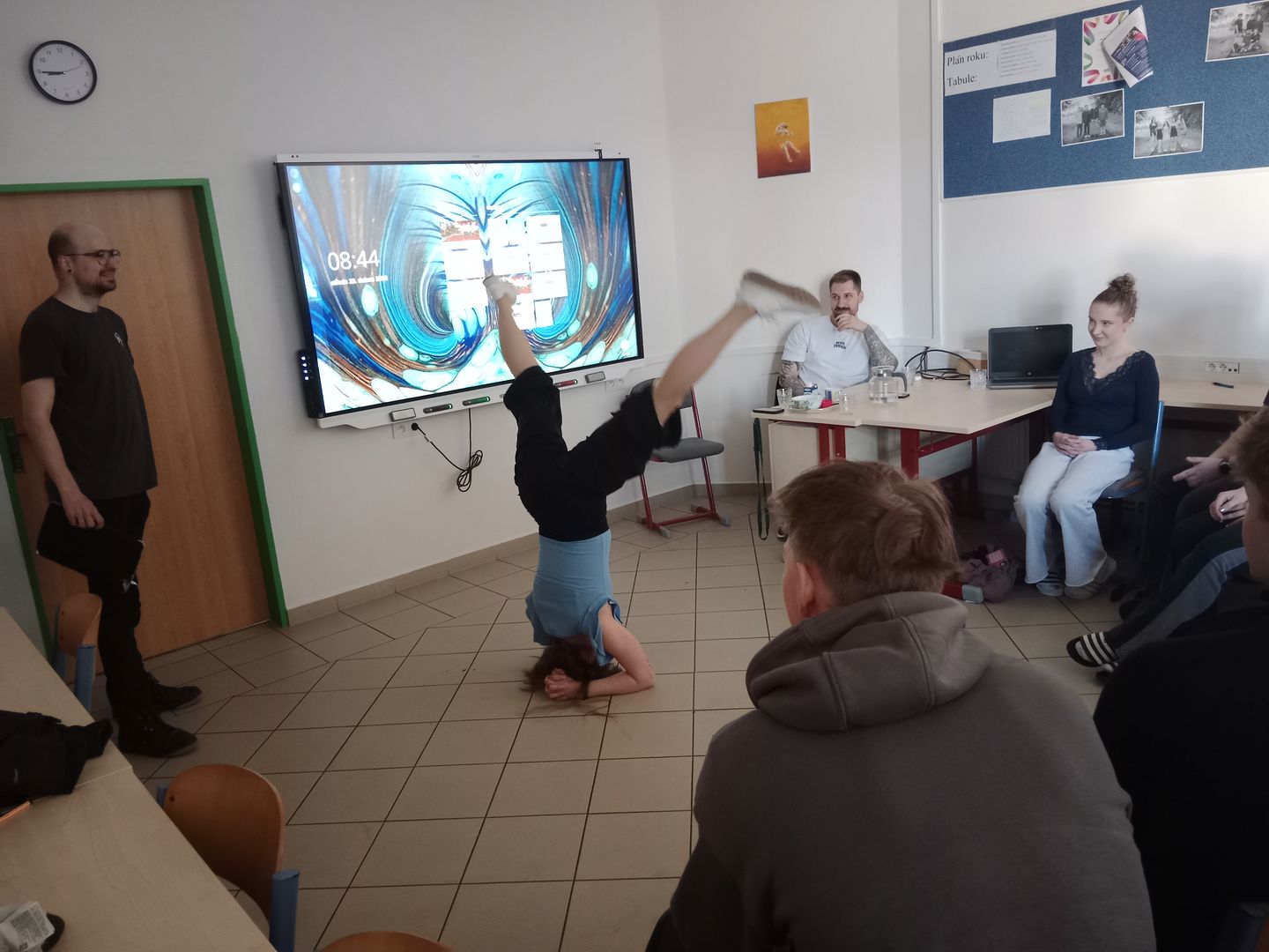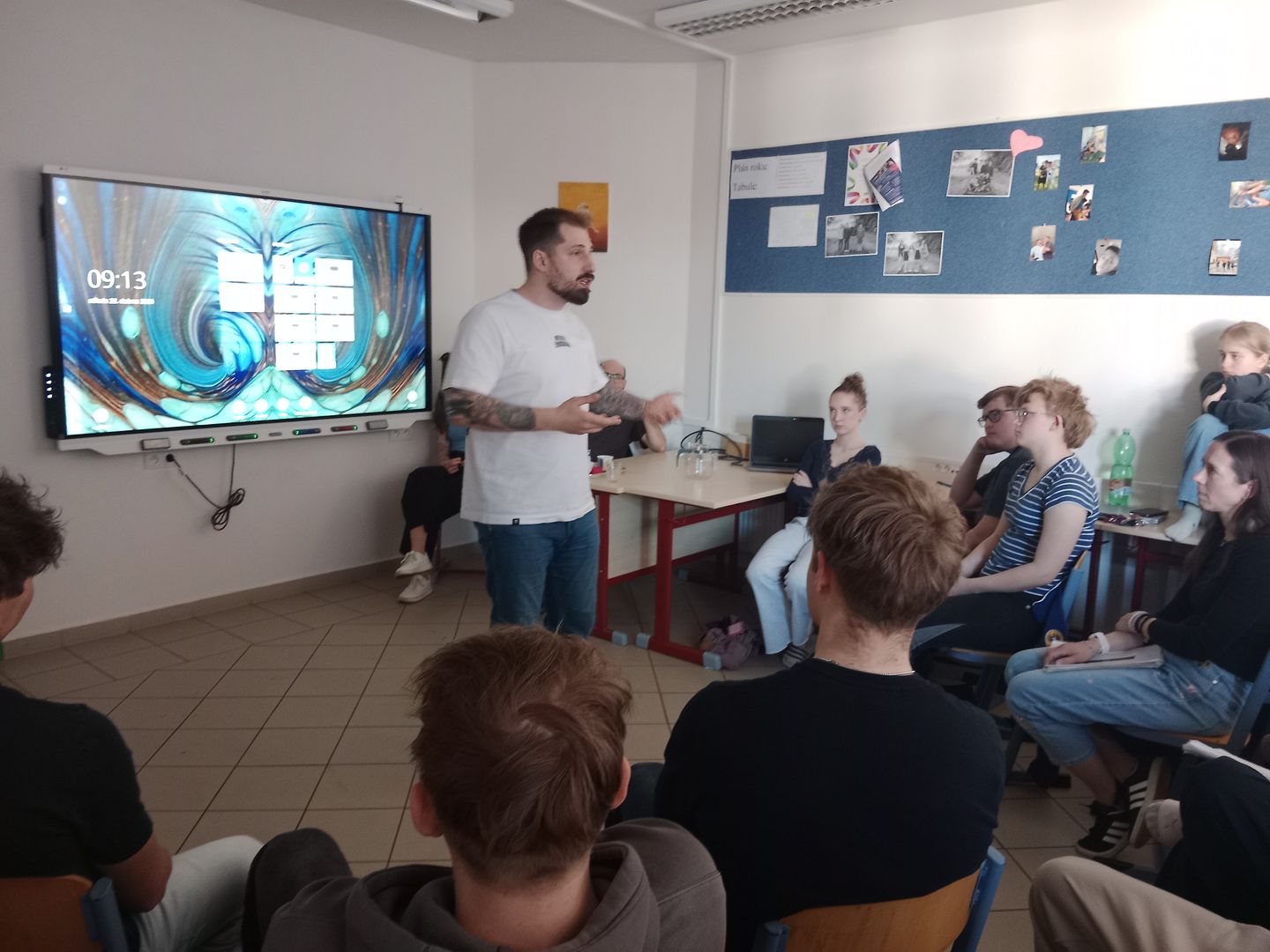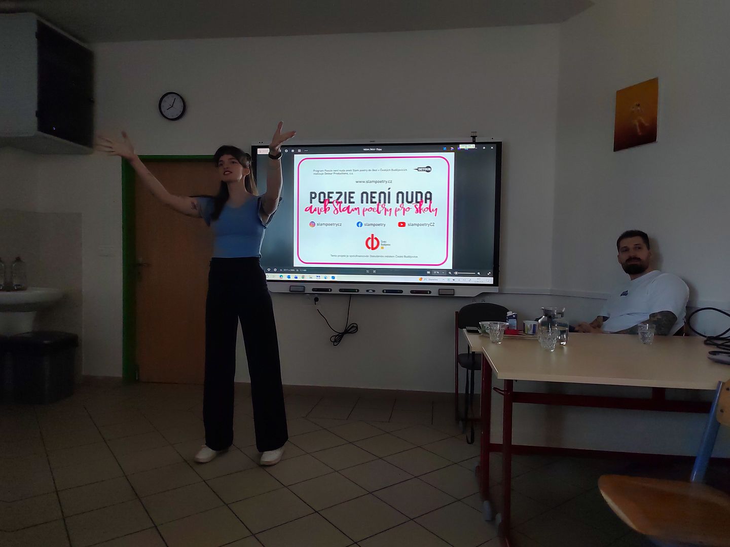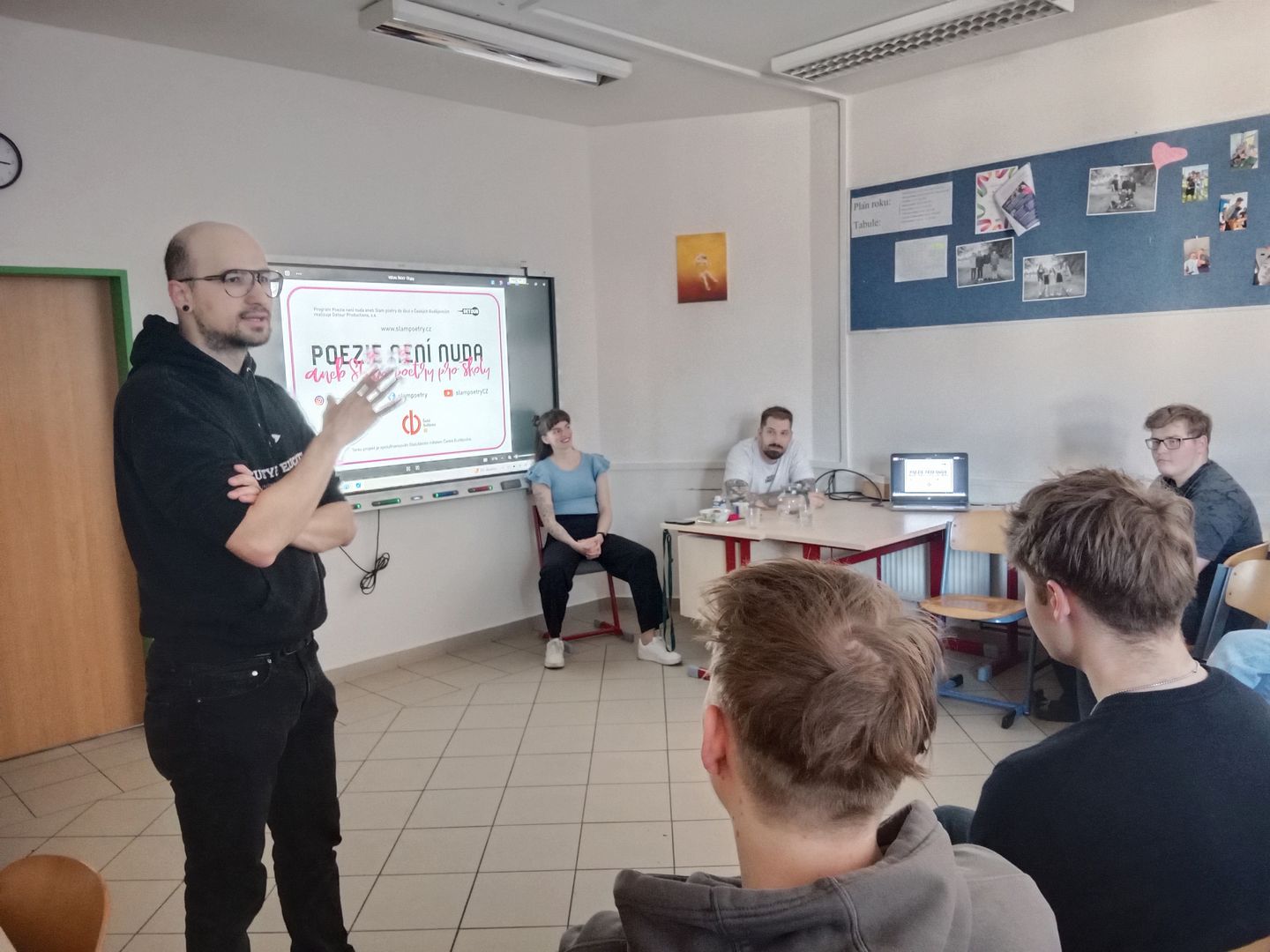 Ve středu 22. 4. 2026 dorazili tři talentovaní umělci na České reálné gymnázium, aby žákům kvinty, sexty a septimy představili žánr slam poetry.