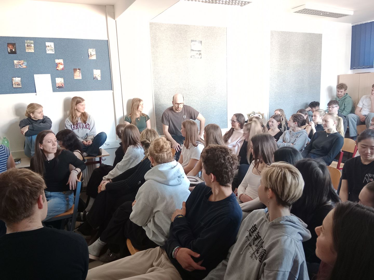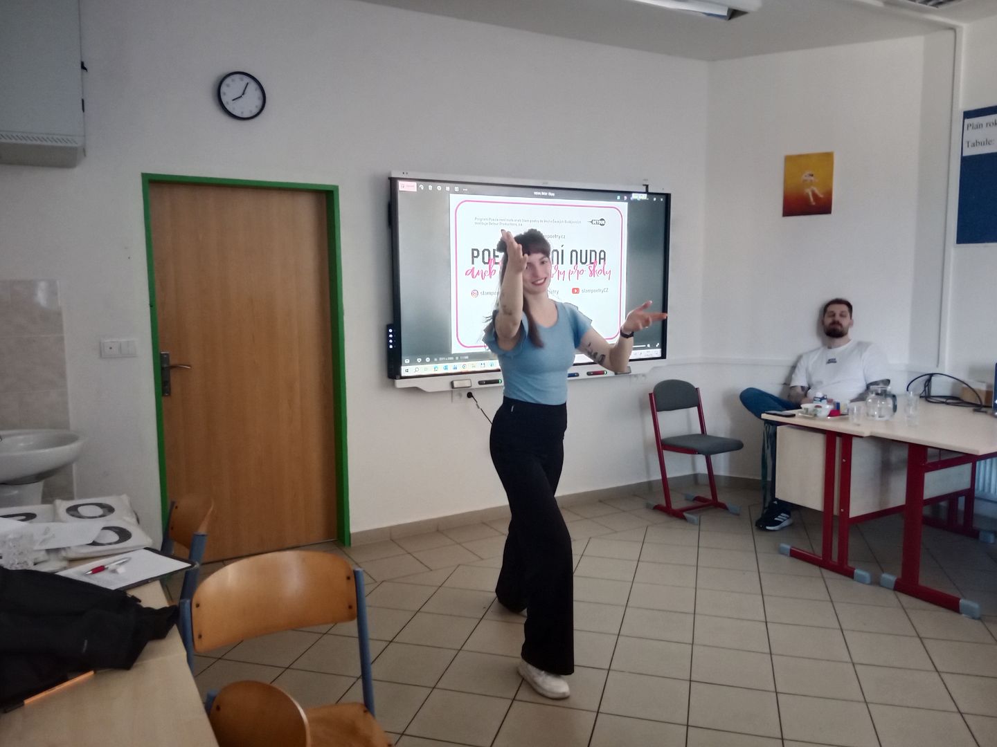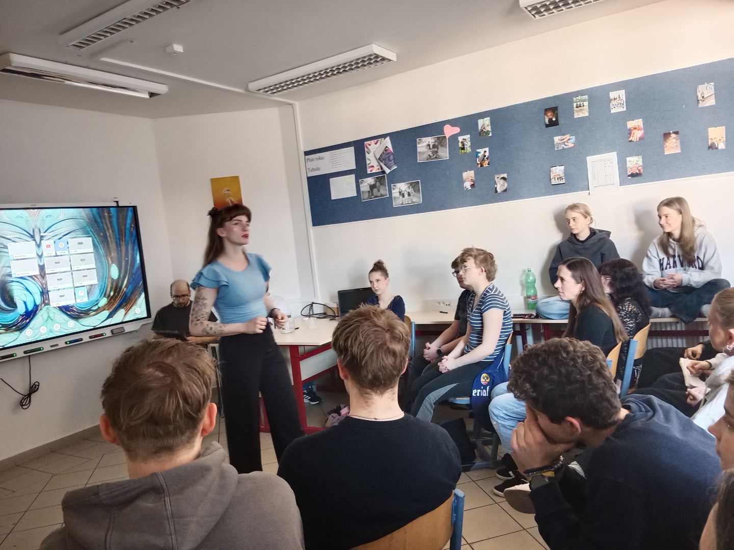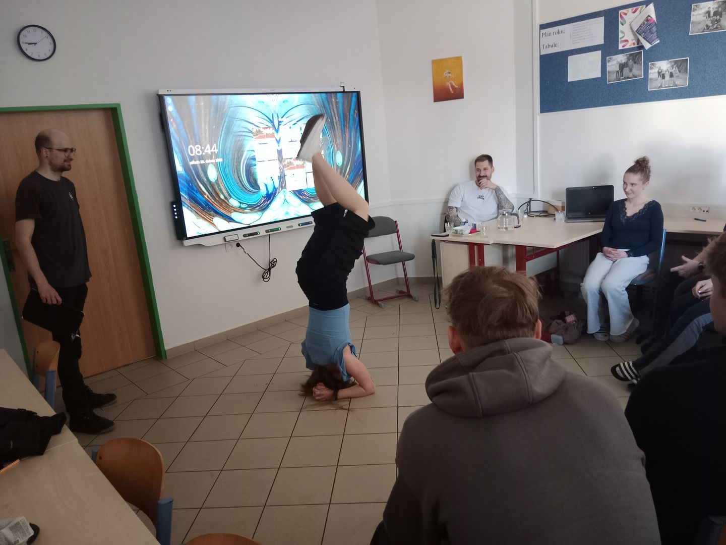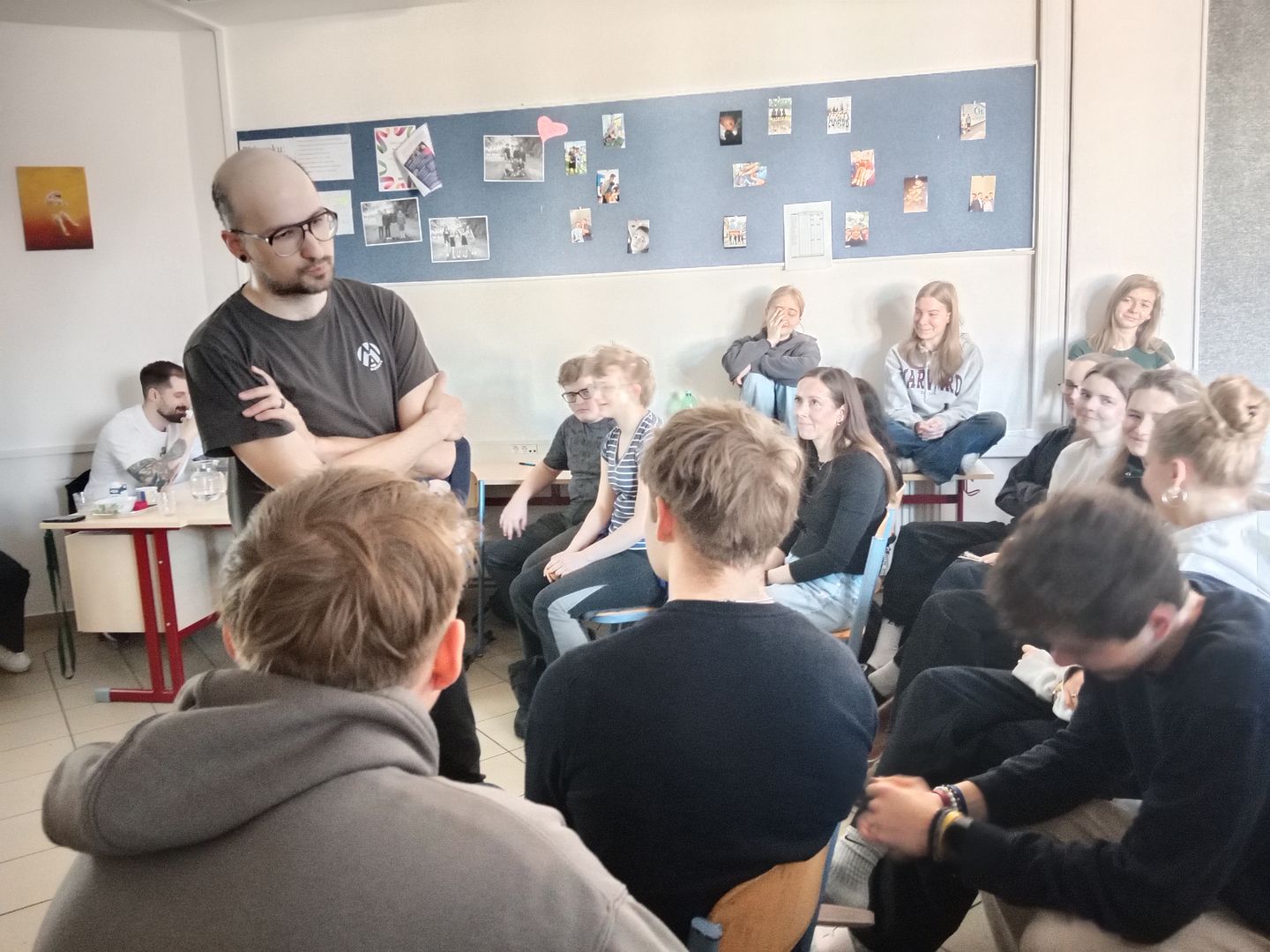 Ve středu 22. 4. 2026 dorazili tři talentovaní umělci na České reálné gymnázium, aby žákům kvinty, sexty a septimy představili žánr slam poetry.